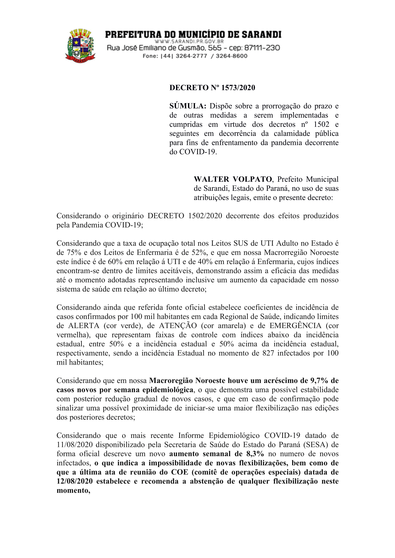 Decreto Nº 1573/2020 dispõe sobre a prorrogação do prazo das medidas adotadas no decreto nº 1502/2020