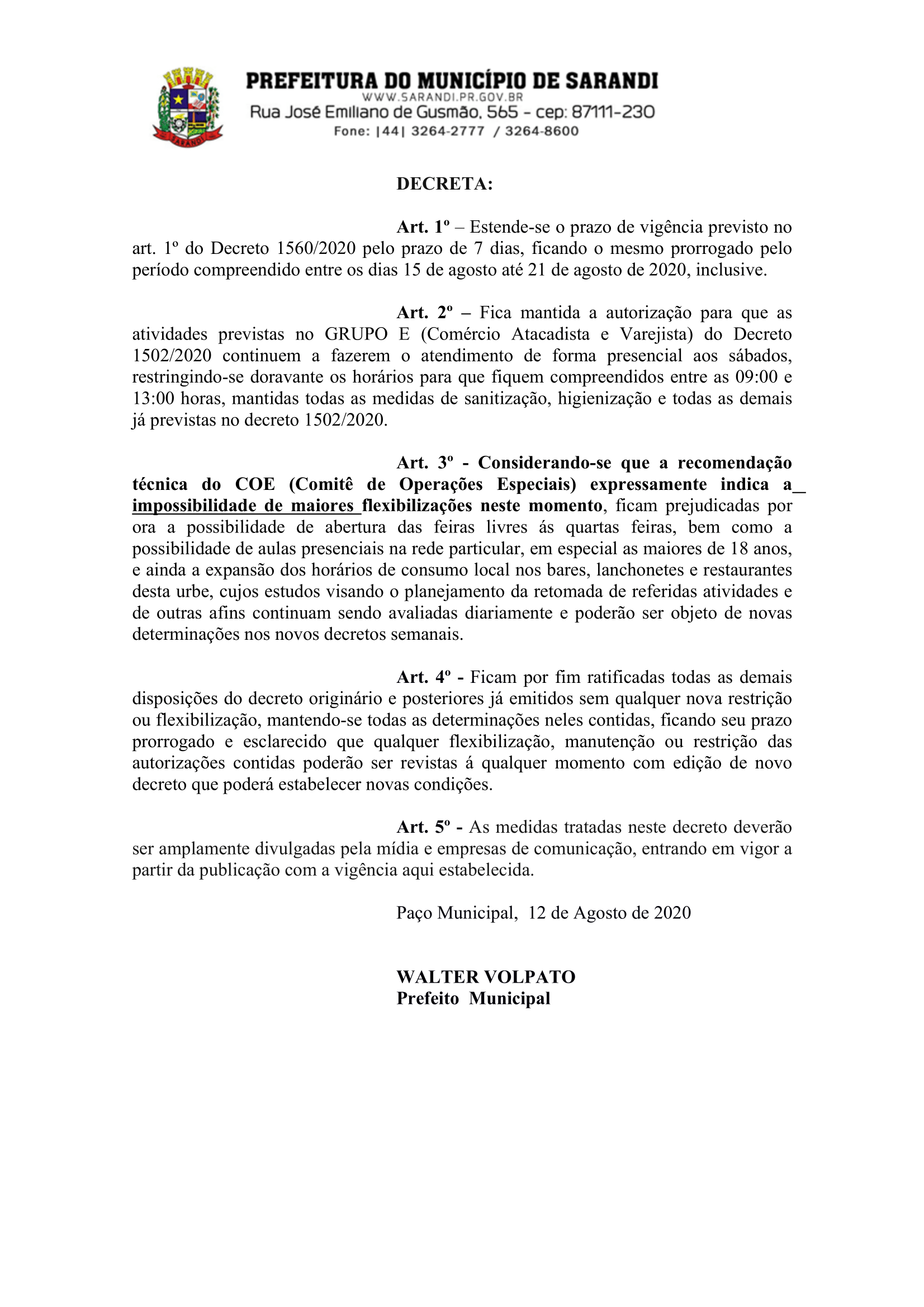 O seguinte decreto estende-se o prazo de vigência pelo prazo de 7 dias, ficando prorrogado todas as medidas já adotadas entre os dias 15 até 21 de agosto de 2020.