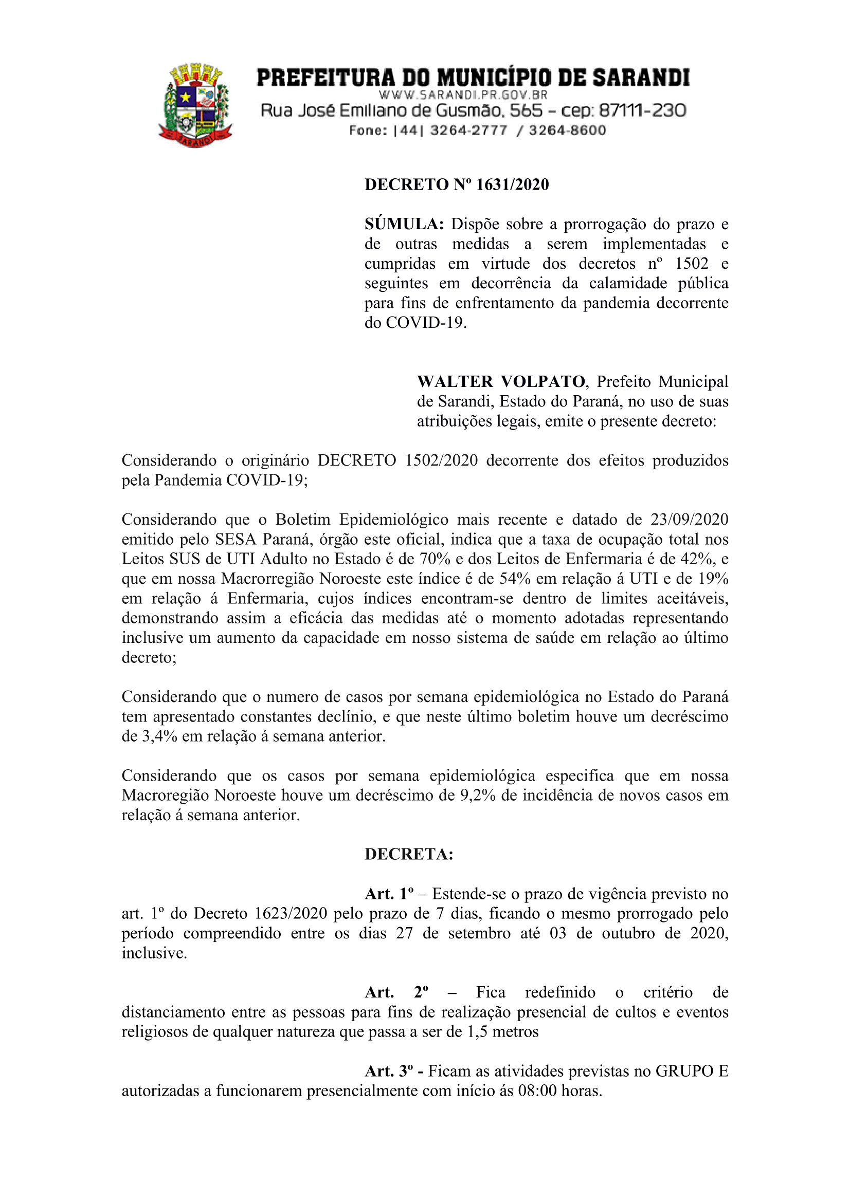 Decreto Nº 1631/2020 dispõe sobre a prorrogação do prazo de vigência previsto no art. 1º do Decreto 1623/2020; Redefinido o critério de distanciamento para cultos e eventos religiosos; Mudança no horário de abertura das atividades do GRUPO E (comércio atacadista e varejista); Prorrogação no horário de atendimento de academia, atividades de ginástica e afins; Aumento no limite de pessoas para casa de eventos, associações recreativas, áreas