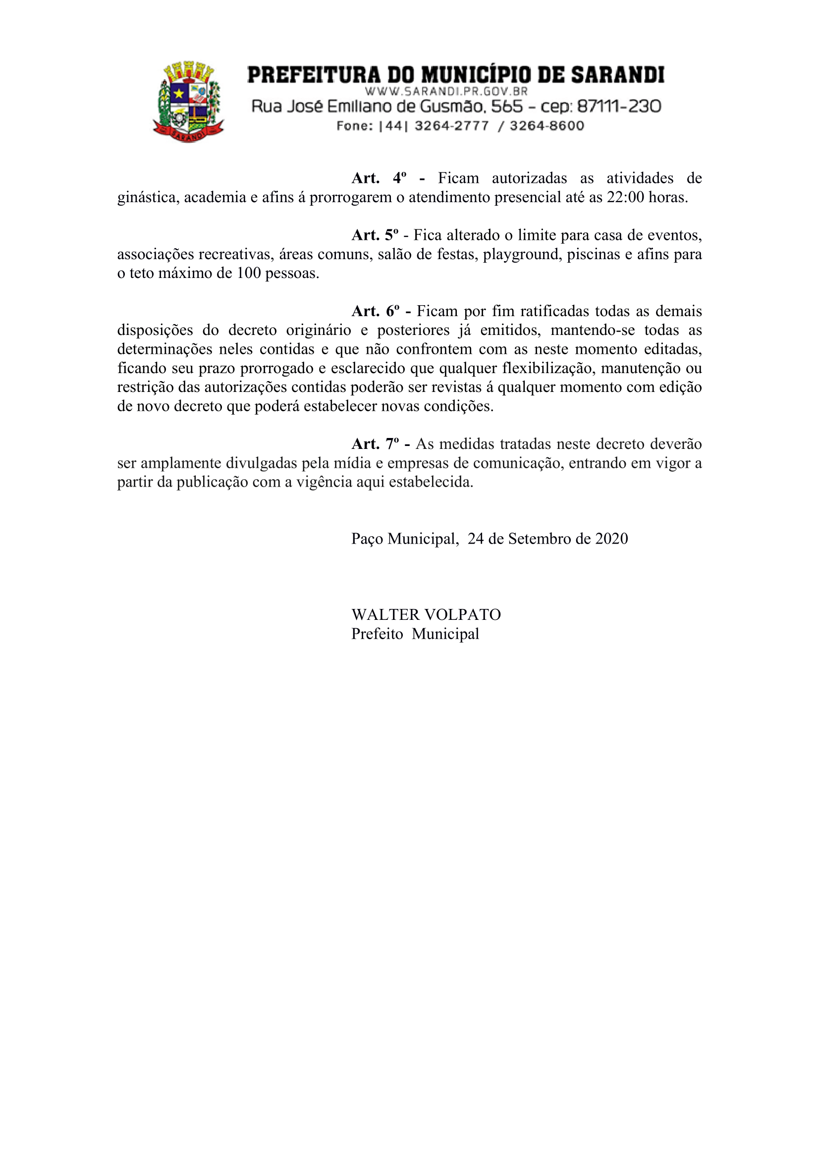 - Ficam autorizadas as atividades de ginástica, academia e afins á prorrogarem o atendimento presencial até as 22:00 horas.