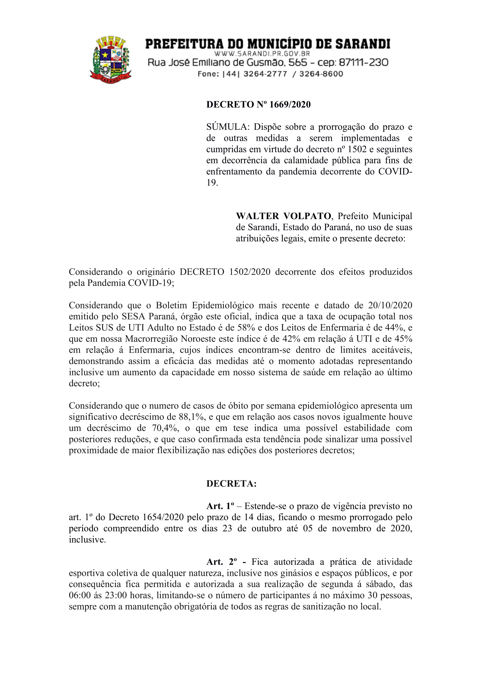 Decreto Nº 1669/2020 dispõe sobre a prorrogação do prazo de vigência previsto no art. 1º do Decreto 1654/2020;