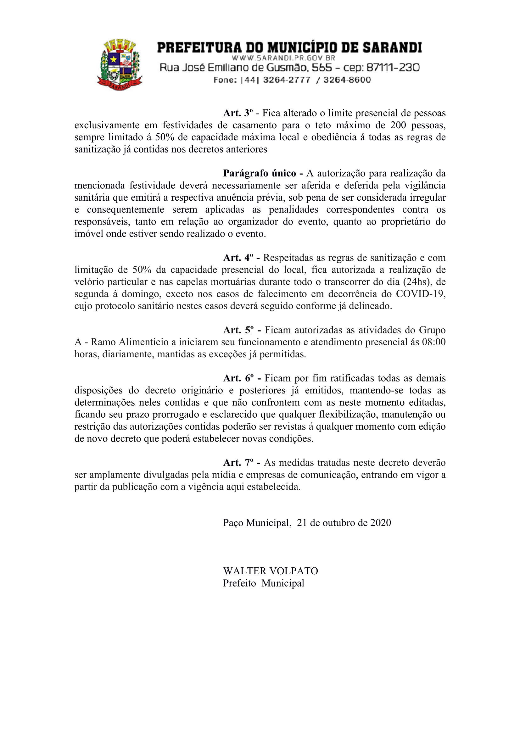 - Fica alterado o limite presencial de pessoas exclusivamente em festividades de casamento para o teto máximo de 200 pessoas, sempre limitado á 50% de capacidade máxima local e obediência á todas as regras de sanitização já contidas nos decretos anteriores.