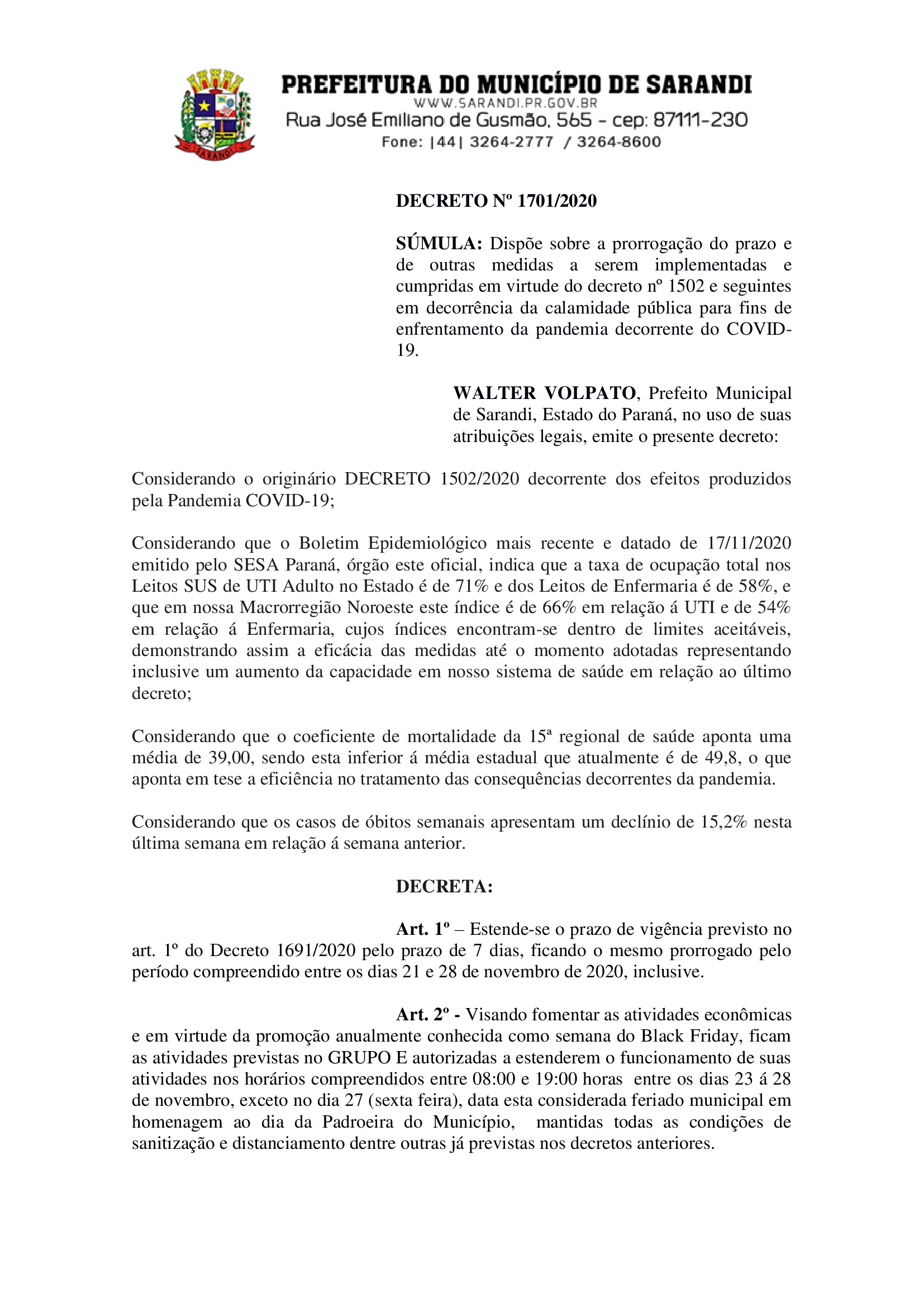 Decreto Nº 1701/2020 estende o prazo de vigência previsto no art. 1º do Decreto 1691/2020 pelo prazo de 7 dias; Novas medidas direcionadas para as atividades relacionadas ao GRUPO E por conta da semana da Black Friday; Todas as outras medidas já determinadas em decretos posteriores permanecem inalteradas.