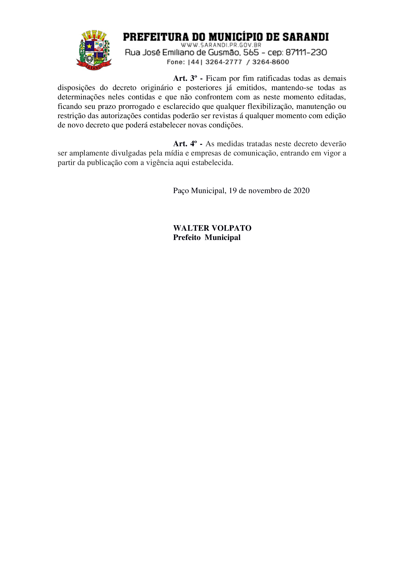 - Ficam por fim ratificadas todas as demais disposições do decreto originário e posteriores já emitidos, mantendo-se todas as determinações neles contidas e que não confrontem com as neste momento editadas, ficando seu prazo prorrogado e esclarecido que qualquer flexibilização, manutenção ou restrição das autorizações contidas poderão ser revistas á qualquer momento com edição de novo decreto que poderá estabelecer novas condições.