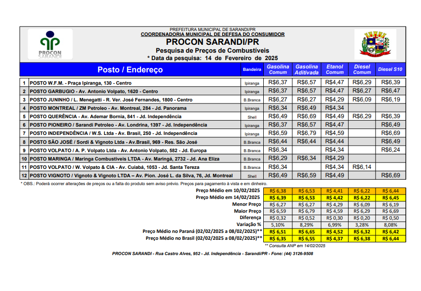 A Coordenadoria de Proteção e Defesa do Consumidor de Sarandi (PROCON SARANDI), por meio da Divisão de Fiscalização, realizou nesta sexta-feira (14) nova pesquisa de preços do combustível. Foram pesquisados os preços da gasolina comum, gasolina aditivada, etanol, diesel e diesel S10, nos 12 postos de combustíveis da cidade. Os menores preços encontrados foram: