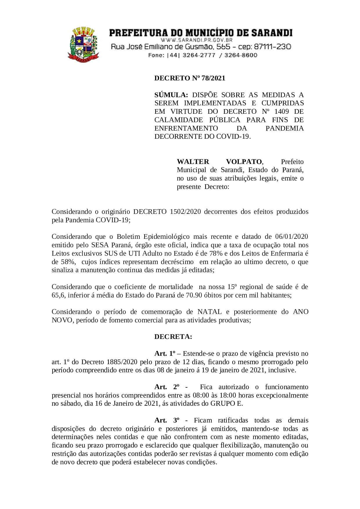 Decreto Nº 78/2021 estende o prazo de vigência previsto no art. 1º do Decreto 1885/2020 pelo prazo de 12 dias; Autorizado o funcionamento das atividades do GRUPO E (Comércio atacadista e varejista) no sábado, dia 16 de janeiro, das 08h às 18h.