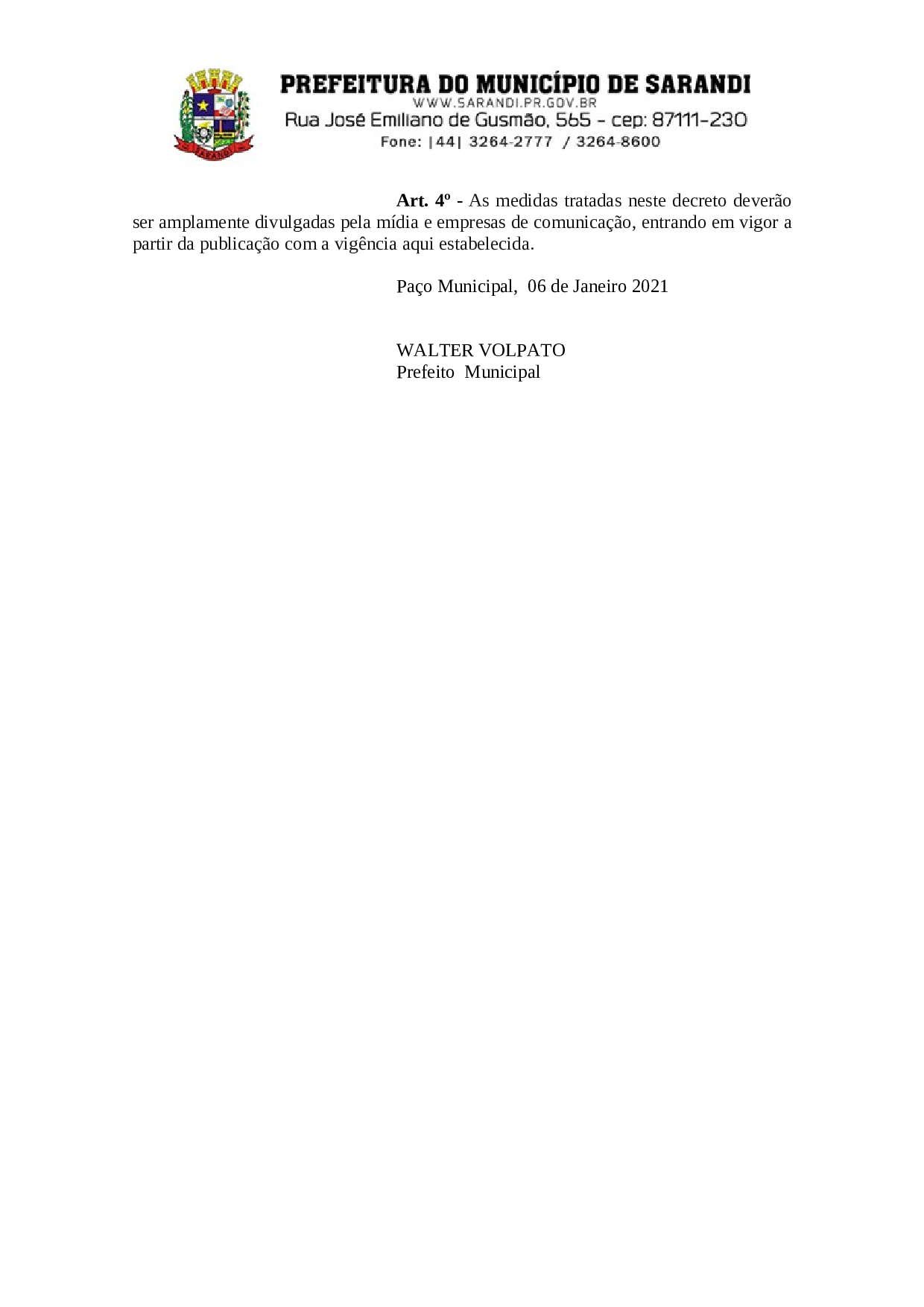 - Ficam ratificadas todas as demais disposições do decreto originário e posteriores já emitidos, mantendo-se todas as determinações neles contidas e que não confrontem com as neste momento editadas, ficando seu prazo prorrogado e esclarecido que qualquer flexibilização, manutenção ou restrição das autorizações contidas poderão ser revistas á qualquer momento com edição de novo decreto que poderá estabelecer novas condições.