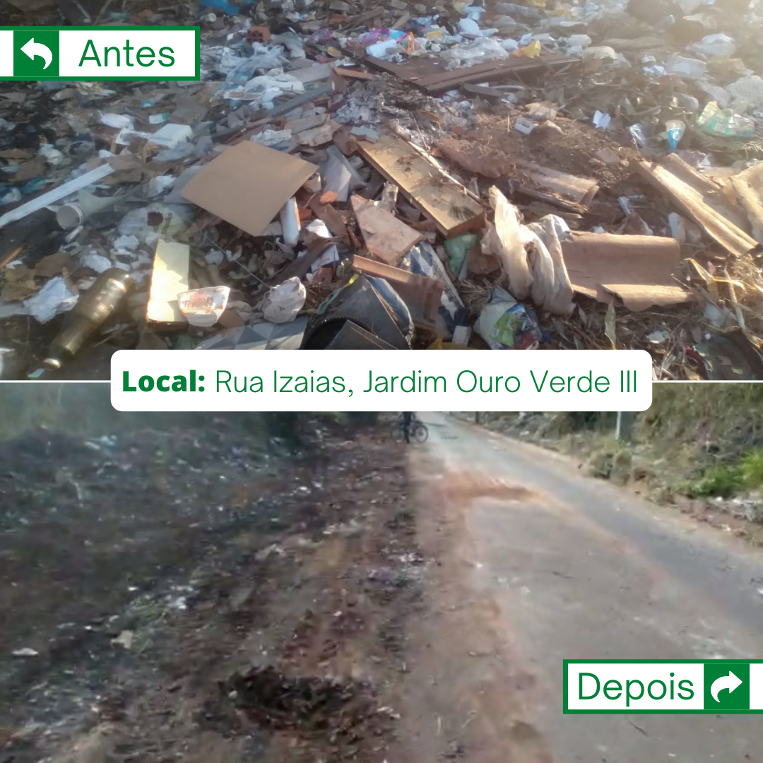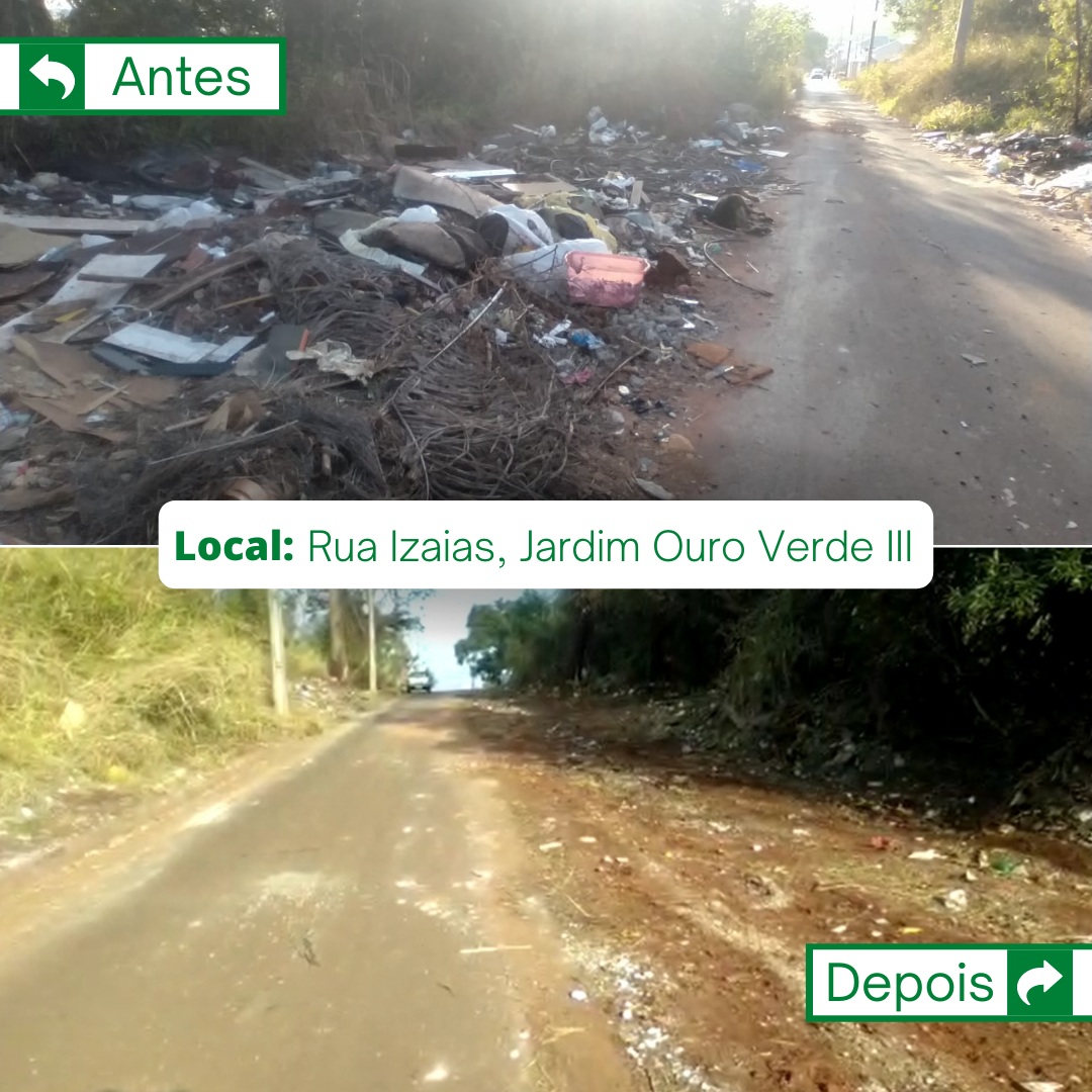 A Secretaria de Saneamento e Meio Ambiente esteve realizando a limpeza de uma grande quantidade de lixo presente no final da Rua Izaias Francisco dos Santos, Jardim Ouro Verde III, ao todo, foram necessários 03 dias para realizar o serviço. Informamos aos moradores que foi intensificada a fiscalização e patrulhamento em todos os pontos conhecidos para descarte de resíduos de forma ilegal. Jogar lixo em áreas públicas pode ser tipificado como crime ambiental previsto no artigo 54 da lei 9.605/98, resultando na pena de um a quatro anos de reclusão e multa.